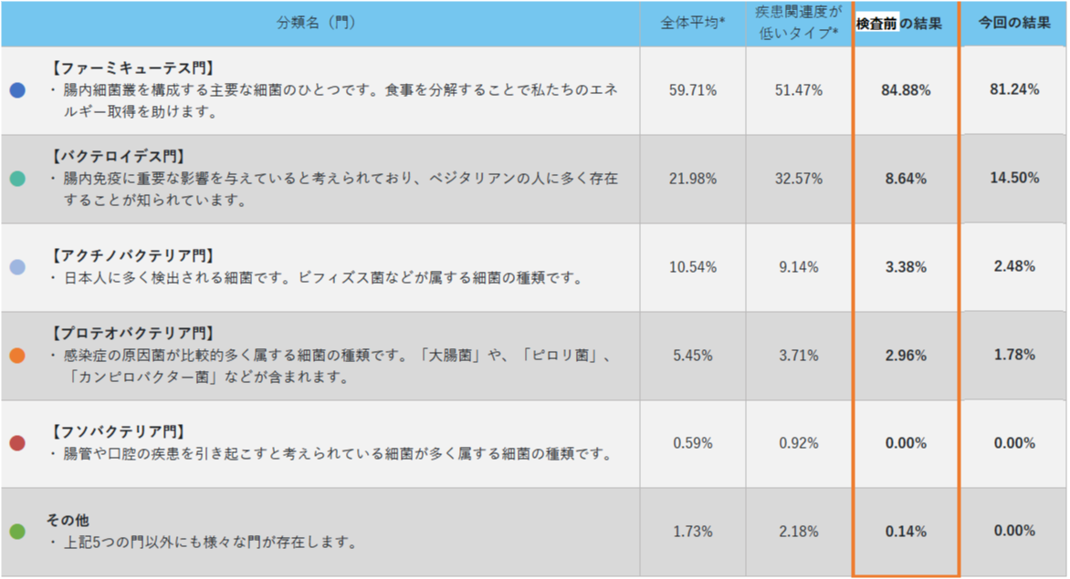 また、多様性というカテゴリーにおいては、レベル2からレベル3へと改善しました。加えて、腸や口腔に疾患を引き起こすとされている大腸菌やピロリ菌、カンピロバクター菌などが含まれるプロテオバクテリア門については2.96%から1.78%に減少しており、結果的に腸内環境が改善されたことが分かりました。