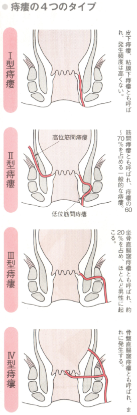 痔瘻は、お尻がはれて激しく痛み、うみが出てくるという症状がくり返し起こります。痔瘻には、原発巣である肛門腺からうみが進む経路によって4つのタイプがありますが、もっとも多いのは、瘻管が内肛門括約筋と外肛門括約筋の間にあるⅡ型です。