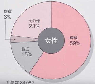 男性も女性も症例数が1番多いのは痔核(いぼ痔)ですが、男性は痔瘻が2番目に多いのに対し、女性は裂肛(切れ痔)が2番目に多くなっています。これは、女性は便秘が多いため、裂肛になりやすいからです。女性の便秘の人が多い年齢層と裂肛の人が多い年齢層はちょうど一致していて、どちらも20代後半及び40代です。
