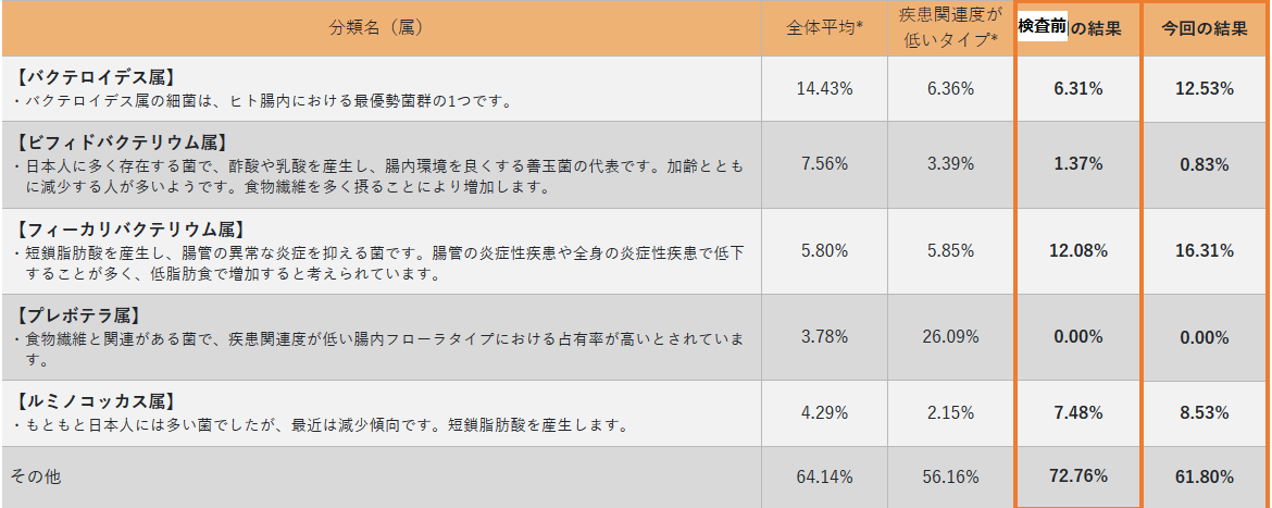 また、多様性というカテゴリーにおいては、レベル2からレベル3へと改善しました。加えて、腸や口腔に疾患を引き起こすとされている大腸菌やピロリ菌、カンピロバクター菌などが含まれるプロテオバクテリア門については2.96%から1.78%に減少しており、結果的に腸内環境が改善されたことが分かりました。