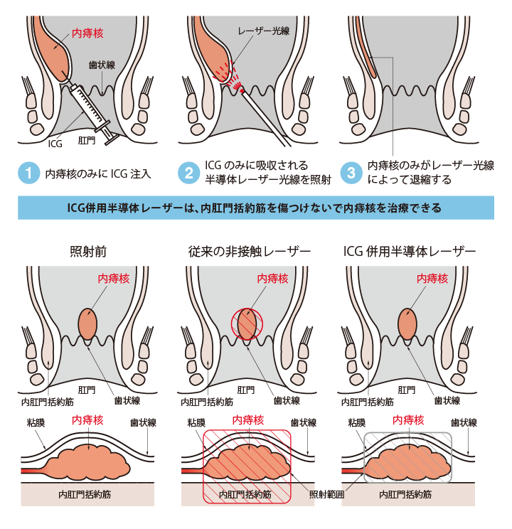 ICG(インドシアニン・グリーン)とは、肝機能の測定に用いる人体に無害な色素です。このICGにはレーザー光線を吸収する性質があり、これを利用することでレーザー光線の照射を制御する治療法です。痔核を直接切開せず、レーザー光線を照射するだけなので、出血や痛みが非常に少なく、短い入院日数で済みます。