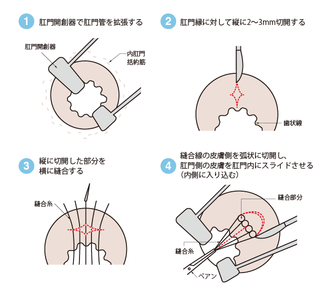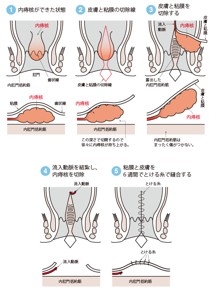 肛門括約筋を保護しながら行う手術法で、肛門括約筋を一切傷つけません。このため、筋肉を傷つけることで起こる後遺症の心配が全くありません。内痔核を完全に取り去る一方、内痔核の上にある肛門粘膜をできる限り傷つけないように保護します。さらに、半閉鎖法で用いる自然にとける糸を使って縫合し、粘膜にダメージを与えません。